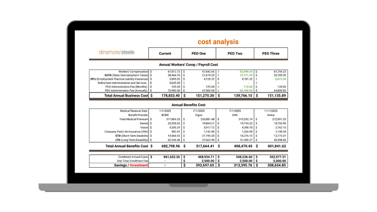 Businesses that work with Dinsmore Steele save up to 42% on PEO costs while gaining better benefits, compliance peace of mind, and HR efficiency. Access IRS-certified, NAPEO-accredited PEOs. Save time by avoiding multiple sales meetings and long research cycles. Cut costs through competitive bidding and expert negotiation. Gain confidence knowing you’re matched with the best PEO for your size, industry, and growth stage.